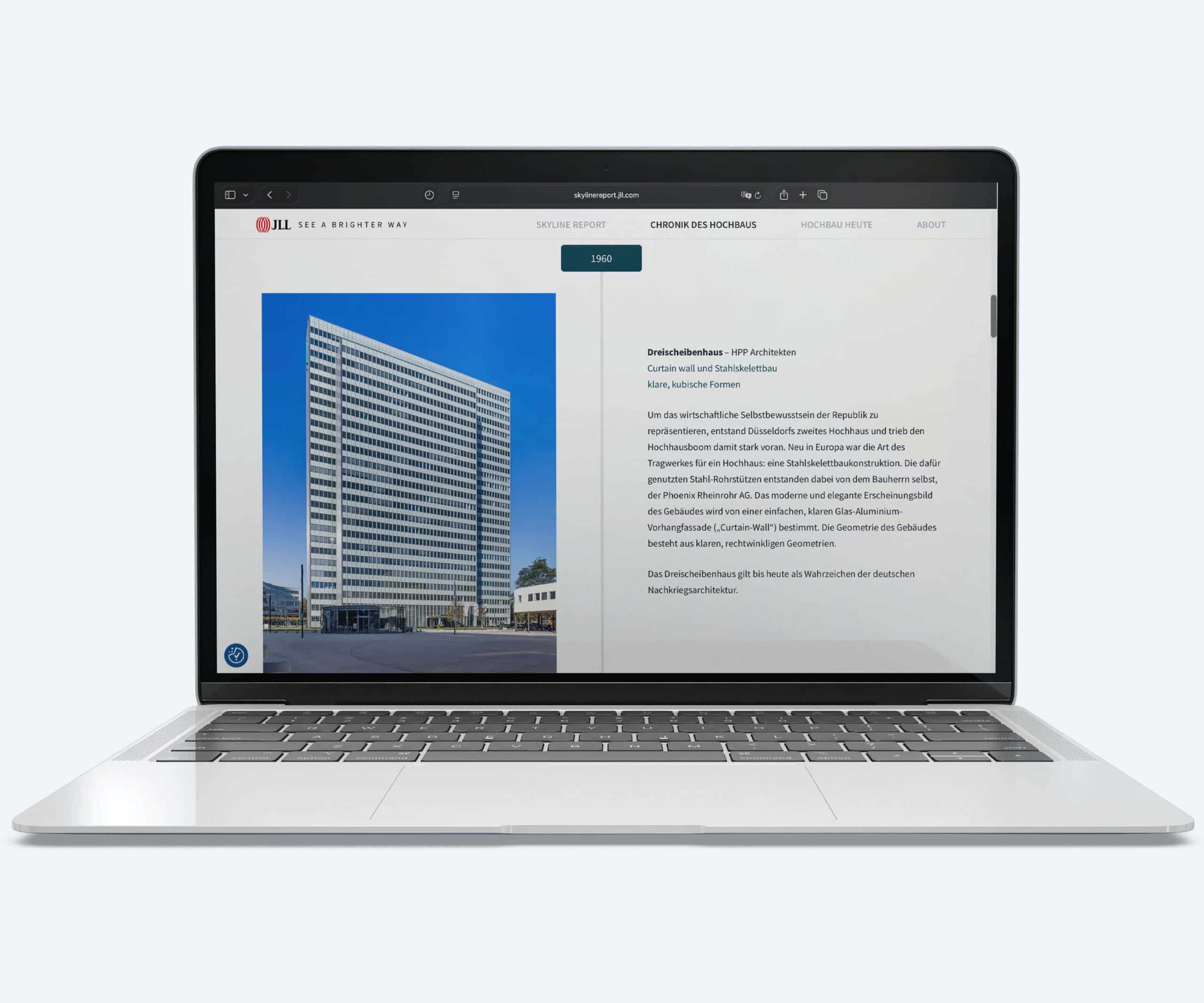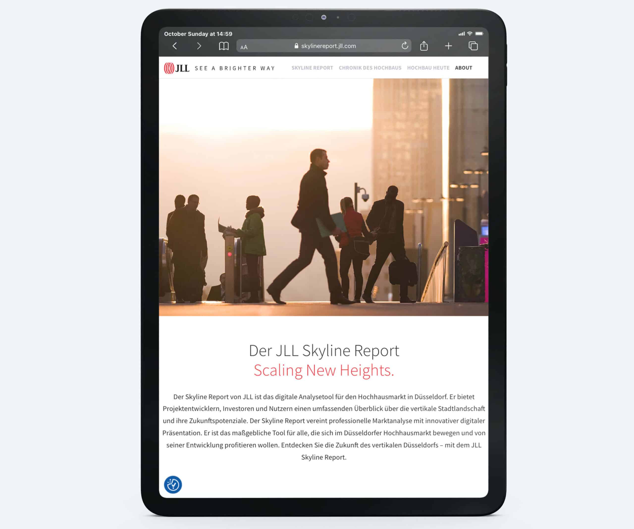 Ich hatte die große Ehre, zusammen mit der Grafikabteilung von Jones Lang LaSalle IP, Inc. in Frankfurt, ein digitales Tool für den internen Vertrieb von JLL in Düsseldorf zu entwickeln. Der sog. ‚Skyline Report – Let’s shape the future of real estate for a better world.‘!